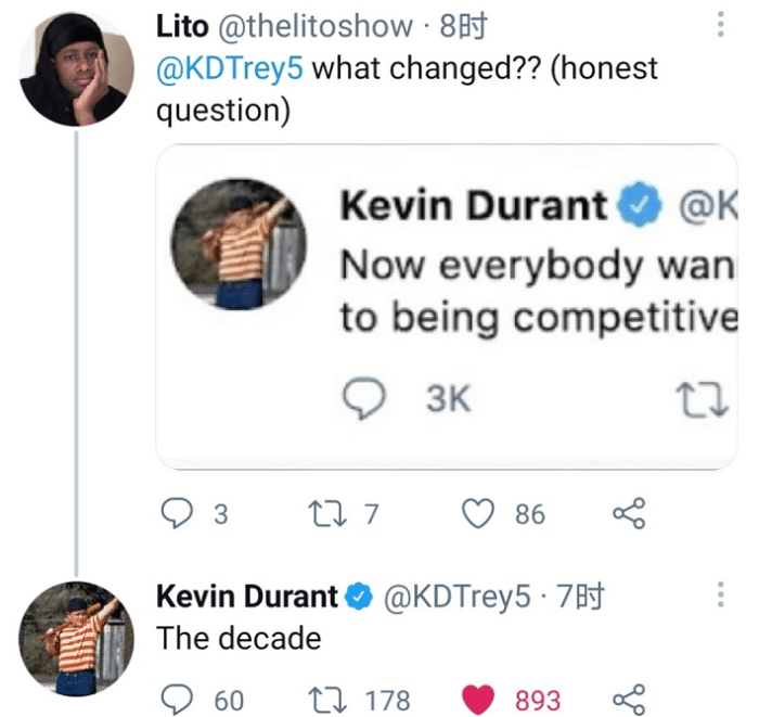 一名球迷翻出这条动态,转发并且提到杜兰特,称:所以是什么改变了你?诚实的回答!