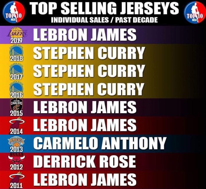 去年的日本球衣销量排行榜,八村塁是排名榜首的。而在本赛季渡边的崛起之后,这位混血天才选手身上的聚光灯似乎被分走了不少。不过八村本赛季的表现的确照新秀赛季略有下滑:处子赛季场均13.5分6.1篮板1.8助攻0.77抢断0.17盖帽投篮命中率46.6%罚球命中率82.9%;而本赛季在场均上场时间完全相同的情况下拿到12.5分5.4篮板1.7助攻0.70抢断0.07盖帽。诚然,有威斯布鲁克分化数据的原因,但是在有更强的火力点吸引防守的情况下投篮命中率和罚球命中率降低到45.7%和75.8%实属令人失望。5.勒布朗-詹姆斯(洛杉矶湖人)
