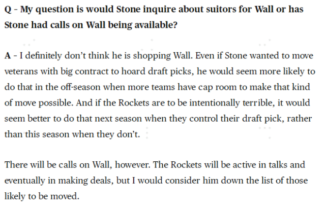 其三,费根指出了火箭对于沃尔的操作可能性,他认为航空城至少要到休赛期,各队有薪资空间的情况下,斯通才可能处理掉他的大合同。他指出如果交易截止日前有球队愿意讨论沃尔的交易,火箭必定会非常积极的跟进,但很可惜沃尔基本不会有下家。