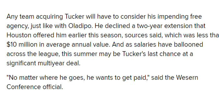 记者在文章中报道,奥拉迪波和塔克是火箭目前两个最有交易价值的球员。而交易走塔克的前景非常光明,包括湖人、雄鹿、热火、篮网、费城、掘金等队都对塔克表达了兴趣。原本在赛季前,火箭可以和森林狼达成交易,用塔克换取首轮签,但当时火箭拒绝了,因为他们认为可以留住哈登。