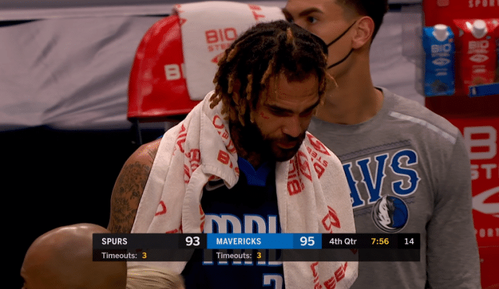 第四节7分56秒,德里克-怀特持球突破上篮,岂料独行侠替补中锋直接从背后推倒铂尔特尔,然后后者撞倒怀特,怀特身体失去平衡,从空中摔倒;考利斯坦这一次“隔山打牛”恶犯动作险些弄伤怀特和铂尔特尔,对于这一幕,裁判多次回放,最终吹罚考利斯坦一级恶意犯规,马刺获得两罚一掷,考神小弟这动作太脏了。