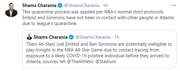 来源:JRS直播网03-08 20:06JRS直播网讯北京时间3月8日,距离NBA全明星正赛只剩下不到8小时时间了,然而根据名记报道,NBA全明星名单将发生了变动,西蒙斯和恩比德因为接触了新冠阳性的理发师将缺席比赛,幸运的是西蒙斯和恩比德并未接触其他全明星球员,根据联盟规定,这两位全明星球员将在亚特兰特隔离,锡安将进入杜兰特队首发。