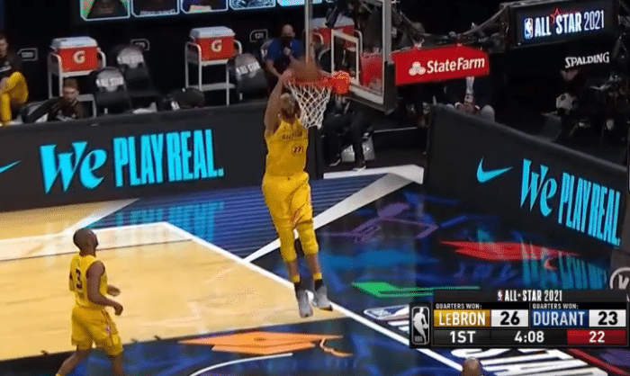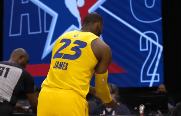 比赛中段两支球队也是换上了替补球员,詹姆斯与库里生涯首次连续,詹姆斯运传球给库里,库里超远三分命中,这是詹姆斯和库里生涯的首次连线。保罗眼花缭乱的花式运球后助攻戈贝尔暴扣得手,欧文反击胯下击地送助攻,拉文起飞高难度空接上篮命中,首节比赛詹姆斯队40:39领先杜兰特1分。首节的比赛詹姆斯队这边三分球19次出手命中6球,而杜兰特队这边19次出手命中了5球。首节的比赛打完的时候,恩比德更新了社交媒体,他说道:米老鼠般的全明星赛。
