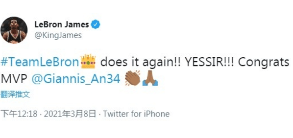 詹姆斯在赛后发文称“勒布朗队又赢一场!Yessir!!!恭喜MVP@字母哥。”