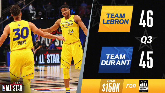 易边再战,扣篮大赛结束后,下半场重新开启,詹姆斯队方面换阵由利拉德顶替詹姆斯首发出战。急需追分的杜兰特队开局不断尝试三分,比尔手热一人飙进3记三分,加上欧文连续冲击内线得分蚕食比分,詹姆斯队攻势虽然不如对手,但东契奇同样回敬两记三分稳住局势。节中詹姆斯队重新接管比赛,字母哥有如神助打板命中三分,库里则稳稳命中空位三分帮助球队手握大比分优势。拉锯战中杜兰特队迟迟打不出进攻高潮,暂停回来乔治和布朗联手命中4记三分更是继续扩大优势。虽然哈登和康利相继命中三分止血,但乔治手感还在,他最后的三分进球决定了这一节的胜负,詹姆斯单节46-45再胜杜兰特队进入第四节。