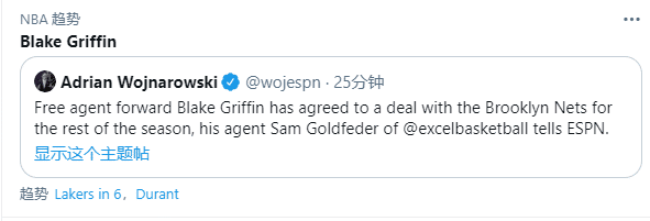 之前名记报道篮网将会引援格里芬时,杜兰特第一时间美媒动态评论区点赞,没过多久格里芬便同意签约篮网,此前格里芬放弃1330万美元和活塞达成买断;目前格里芬加盟篮网已经登上热搜引热议,其中杜兰特、湖人等关键词也引热议。