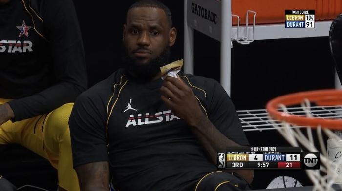 詹姆斯上半场没怎么出汗,但字母哥和库里两人状态爆棚,带领詹姆斯队半场足足领先20分;到了下半场,詹姆斯第三节放弃首发的机会,让利拉德顶替自己首发;不打球也累也饿吗?三旬老詹确实有点饿了,坐在替补席吃零食补充能量,这比赛打得太轻松了。