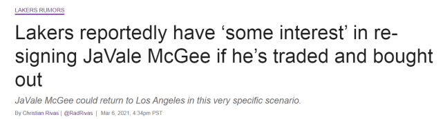 另一位湖人跟队记者Christian Rivas指出,目前来看,湖人最明智的选择还是耐心等待,不要急于出手。他们还有两个阵容名额。或许麦基会被交易后买断,让湖人重新拥有签回他的机会;或许国王在交易截止日时会愿意接受麦金尼+1个次轮签换怀特塞德的报价。这样一来,湖人的内线问题有望得到解决。