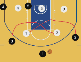 落位:这个战术的初始落位相对灵活,持球人在弧顶,上线左右各一名队友,剩下两名队友可以选择站在篮下或两个底角。