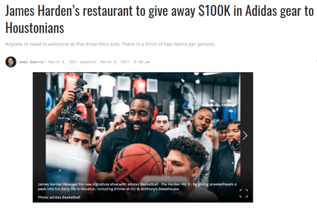 这已经不是哈登第一次为休斯顿伸出援手了。在德州遭遇极寒风暴时,哈登和他的餐厅已经向学校和低收入人群提供了食物。此外,哈登还向有需要的人提供了一卡车瓶装水。
