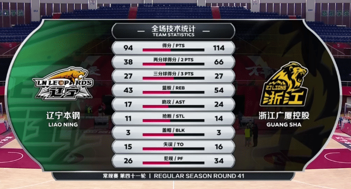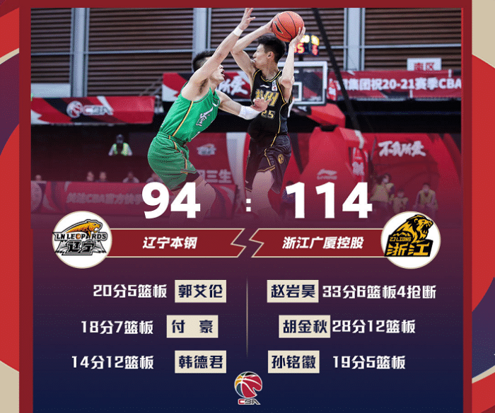 来源:JRS直播网03-04 19:55JRS直播网3月4日讯 今天晚上CBA常规赛焦点战辽篮和广厦的强强对话结束了争夺,最终广厦114-94击败辽篮,这场比赛广厦掌握着主动权,他们首节得到38分,单节领先17分,上半场领先19分,分差也一度拉大到20+,虽然下半场辽篮在郭艾伦的带领下将差距缩小到10分,不过广厦的整体气势和状态更好,他们没有给辽篮翻盘的机会,成功拿下了胜利。胡金秋28分12篮板,孙铭徽19分5篮板5助攻4抢断和赵岩昊33分6篮板4抢断是广厦赢球的最大功臣。郭艾伦(20分5篮板)CBA生涯抢断数来到了645次,超越了辽篮主帅杨鸣(644次),升至CBA历史抢断榜第18位。
