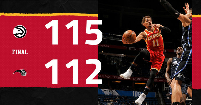 末节,老鹰射手们火力全开,连中七记三分,四分钟时间内打出一波21-4反超1分,魔术仅依靠罚球得到4分。决胜时刻,武切维奇补篮得手,特雷-杨突破造成犯规两罚全中,老鹰领先1分,魔术握有最后一攻机会。最后一攻,罗斯中投不中,科林斯拼下篮板两罚全中,比赛失去悬念。最终,老鹰客场以115-112逆转战胜魔术取得两连胜。