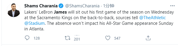来源:JRS直播网03-03 19:07JRS直播网讯北京时间3月3日,名记Shams在湖人输给太阳的比赛后爆料,湖人对阵国王的背靠背的比赛中,詹姆斯将轮休。这是这位36岁的老将,本赛季第一次轮休。