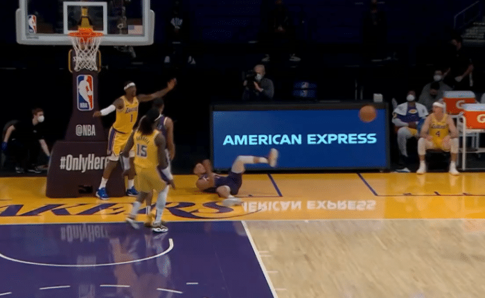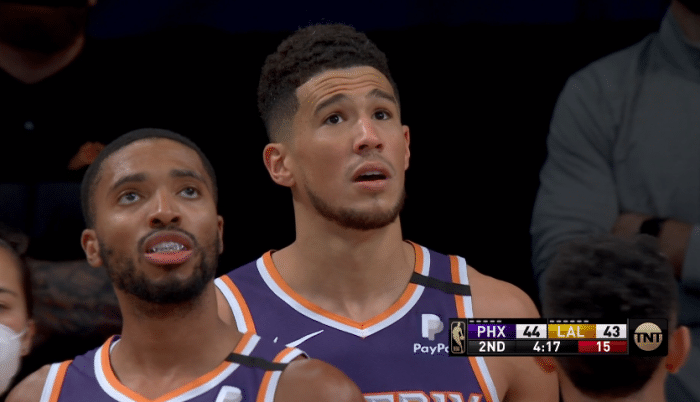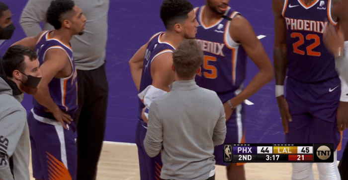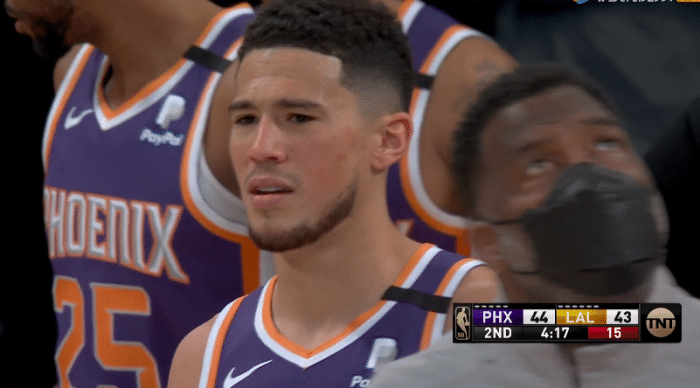 第二节4分多钟,布克追防过程中被达米安-琼斯绊倒,然后布克躺在地板上把波普拉倒,布克这一动作很多余,不过裁判多次回放这一幕,最终并没有给布克恶意犯规,只是普通犯规而已,对此杨毅直言这一球不是恶犯吗?