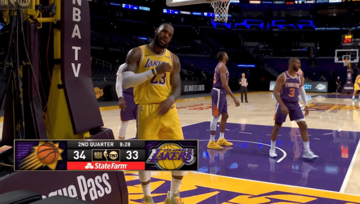 末节湖人替补阵容火力不足,落后10分后詹姆斯重新上篮,强突上篮被吹太阳防守干扰球,然后又上篮得分;可没有保罗和布克的太阳仍旧保持两位数领先;最后6分钟,波普三分投不进,詹姆斯连续命中三记三分续命,无奈湖人缺兵少将,最终湖人主场输给太阳。
