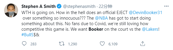 布克遭驱逐瞬间登上推特引争议,当时名记奥康纳发推炮轰裁判吹罚太荒谬,简直就是一个笑话,联盟总裁该管管了;名嘴史密斯则是质疑裁判,因为一些无关紧要的琐事就把布克驱逐了吗?美媒Sports Center晒出布克遭驱逐时的反应:一脸不敢相信的表情。当时詹姆斯对这样的结果也十分震惊,面部表情十分抢镜。