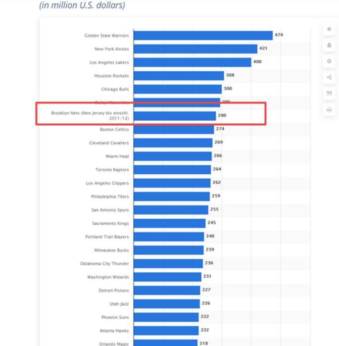 第二部分就是球队的市值,这一块的收入要将球队分红远远甩在身后。根据著名篮球媒体《SPORTICO》公布的NBA球队市值排行榜,因为聚齐了三巨头,以及场边出现的超模、明星,篮网队得到了巨大的关注度,如今的篮网队市值排在尼克斯、勇士、湖人之后,排在NBA第四位,篮网队的市值达到了34亿美元。