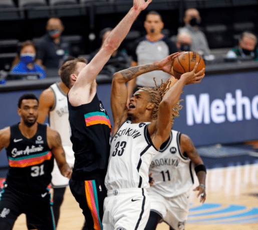 上半场比赛篮网内外线发挥均非常出色,其中欧文命中3记三分贡献12分5助攻,哈登在上半场比赛仅出手4次,但是送出了10次助攻,内线方面小乔丹上半场比赛贡献6分5篮板,克拉克斯顿上半场疯狂吃饼,贡献13分3篮板,马刺方面德罗赞8中7贡献15分6助攻,米尔斯则贡献11分,默里则拿下8分,上半场双方战成57-54,篮网稍稍领先。