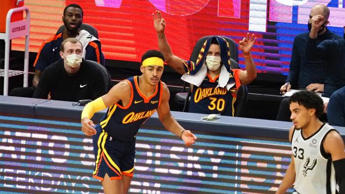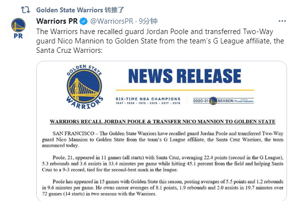 来源:JRS直播网03-02 10:22JRS直播网3月2日讯 北京时间3月2日,勇士官宣,正式从发展联盟召回乔丹-普尔和尼克-曼尼恩,此前勇士把他俩下放到G联盟附属球队圣克鲁兹勇士,只要未来几天他们的新冠检查没问题,他们将在下一场勇士对阵开拓者比赛中复出,终于重返NBA了。