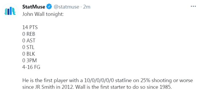 作为火箭队内年薪最高的球员,沃尔的表现相当低迷。他只打了27分钟,16投4中,三分5投0中,仅得到14分5失误,没有其他数据,个人正负值是-33。数据网站显示,沃尔是2012年的JR-史密斯之后第一个得分至少10分,但其他数据挂零且命中率没超过25%的球员。沃尔还是自1985年以来第一位打出这样数据的首发球员。
