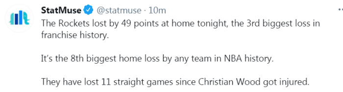 来源:JRS直播网03-01 20:04JRS直播网讯 北京时间3月1日,火箭主场84-133不敌灰熊,遭遇11连败。这场比赛,火箭5大数据被对手完爆,最终以49分之差输掉了这场比赛。数据显示,49分的分差是火箭队史输得第三惨的比赛,这也是NBA历史上主场输分第八多的比赛。通过火箭和灰熊的多项数据对比,我们可以看到他们表现有多差。伍德已经连续缺战11场,火箭11场比赛都输了。