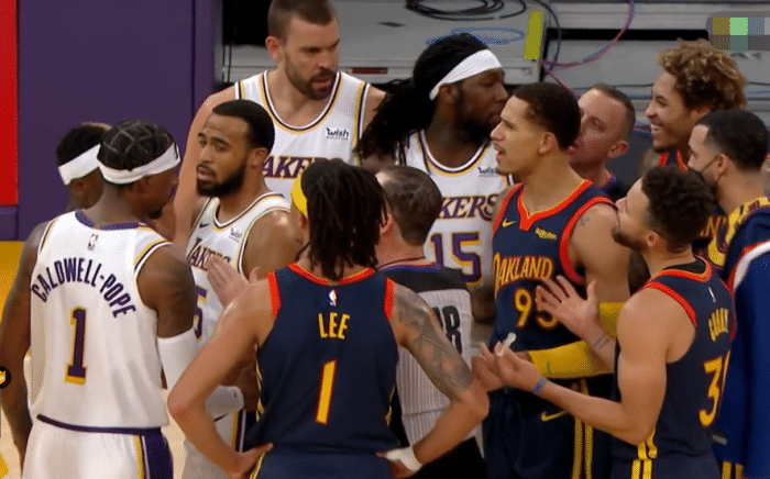 湖人轻松击溃勇士,施罗德库里发生激烈争执,库里跳远犯规引热议