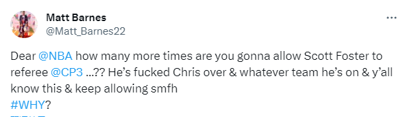 NBA名宿马特-巴恩斯发推写道:亲爱的NBA官方,你还要让福斯特当保罗的多少次裁判?他对保罗不公平,不管保罗在哪个球队,你们都知道这一点,然后继续让这种烂事发生?为什么?