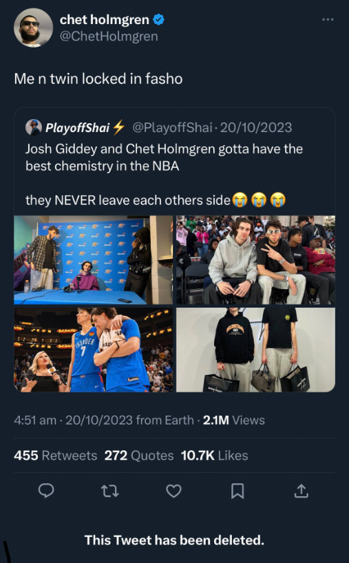 目前吉迪陷入性丑闻一事在网上引起轩然大波,吉迪关闭了他的IIns的评论区,并将头像换成了全黑的图片;他的队友霍姆格伦也有动作,眼见的网友发现,霍姆格伦删除了一条推文——此前有球迷晒切特和吉迪的合影,配文写道:切特和吉迪肯定有着最好的化学反应,他们俩形影不离!”霍姆格伦转发并表示:我和双胞胎兄弟很专注。