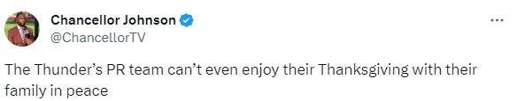 对于吉迪涉嫌性丑闻一事,美记者Chancellor Johnson发推写道: 雷霆的公关团队甚至不能和家人安静地过感恩节!