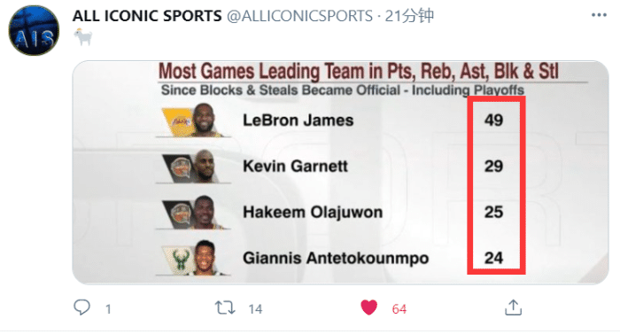 是的,勒布朗这场比赛最让人印象深刻的是他在防守端的努力,对于一名36岁的球员来说,单场4断3帽难度可想而知。值得一提的是,詹姆斯今天5项主要数据都是湖人全队最高,据统计,这是勒布朗生涯第49次在得分、篮板、助攻、抢断、盖帽5项数据上单场领跑全队,高居NBA历史第一(包括季后赛),而历史第二的加内特是29次,詹姆斯可以说是独一档的存在!