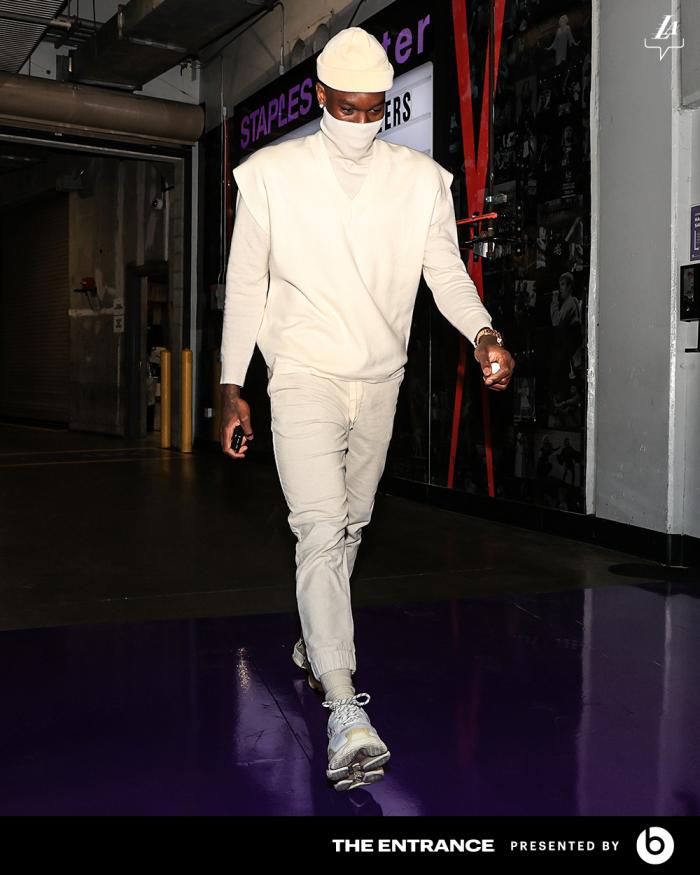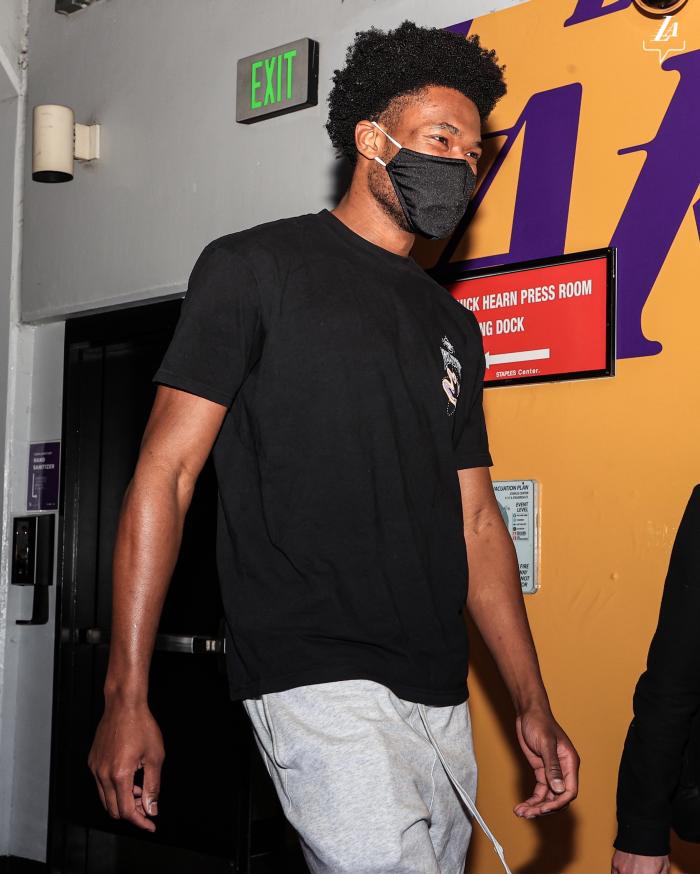勇士两冠王达米安-琼斯身穿灰色运动裤和黑色T恤走进斯台普斯球馆,虽然戴着口罩,但仍旧掩盖不住他内心的喜悦;25岁琼斯司职中锋,身高2米11臂展2米23,体重111公斤,此前被太阳裁掉,然后湖人用短合同签下他;琼斯将在湖人身穿30号球衣。