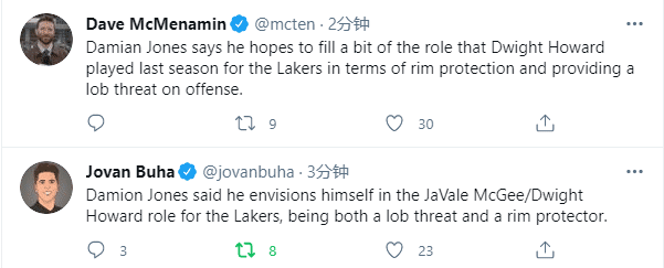 对于加盟湖人,琼斯表示他希望能够在一定程度上承担霍华德上赛季在湖人所承担的任务,做好保护篮筐和提供空接的进攻威胁;琼斯想要成为下一个霍华德,扮演保护篮板和空接吃饼的角色,不过琼斯随时可以上场,但湖人今天和开拓者的比赛,沃帅表示他不太可能上场。