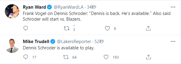 另外要说的是湖人主力施罗德终于解除隔离,复出并且首发出战,此前施罗德因遵守防疫协议缺席4场比赛,湖人惨遭4连败,如今施罗德终于回来,他能在攻防两端为湖人提供支持,也能为詹姆斯分担不小的压力。