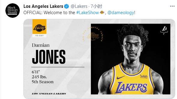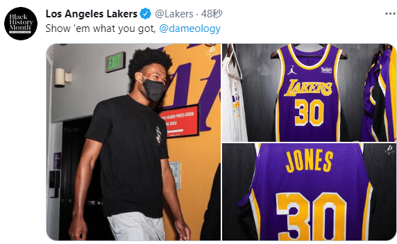 来源:JRS直播网02-27 15:11JRS直播网2月27日讯 北京时间2月27日,湖人新援达米安-琼斯正式亮相,湖人官推晒出琼斯走进球馆的画面,并且湖人官宣琼斯将在湖人身穿30号战袍;此前他和湖人签下一份10天短合同,不过今天对阵开拓者,琼斯不太可能上场。