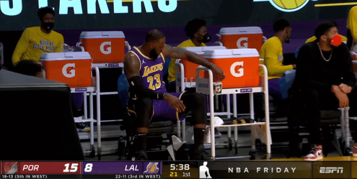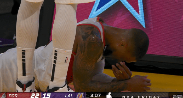 詹姆斯下场后,湖人替补阵容不断缩小分差,见状利拉德强突2+1,不过落地时被误伤痛苦倒地,伤无大碍;暂停回来施罗德连续造犯规四罚全中,詹姆斯换下库兹马,施罗德三分开张,疯狂对攻利拉德,詹皇大帽琼斯,湖人首节24-29落后5分。