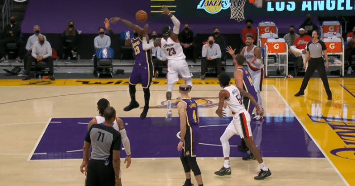 比赛正式开打后,湖人开场进攻糟糕还失误不断,被开拓者打出15-4攻势,陷入被动的湖人开始苦苦追赶,期间詹姆斯下场休息时,施罗德对攻利拉德顶住压力;詹姆斯回来后大帽科温顿反击上篮,压哨大帽小琼斯,湖人首节落后5分。