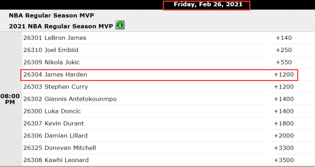 来源:JRS直播网02-27 10:25JRS直播网讯北京时间2月26日,2020-21赛季常规赛MVP的赔率排名更新,詹姆斯(+140)、恩比德(+250)、约基奇(+550)依然排在前三,而状态火热的哈登已经升至第四,和库里同为+1200。要知道2月初的MVP赔率排行榜上,哈登连联盟前16名都没进,显然他近期的状态征服了不少人。