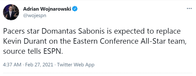 来源:JRS直播网02-27 10:20JRS直播网讯北京时间2月27日,篮网官方宣布,凯文-杜兰特因左腿筋伤势需要更多恢复时间,将缺席本赛季的全明星正赛。随后,NBA官方宣布,步行者球星小萨博尼斯将顶替受伤的杜兰特,入选东部全明星阵容,杜兰特的全明星首发位置,由绿军的塔图姆替代。