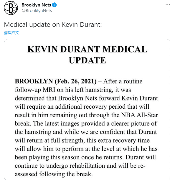 哈登助攻联盟第一,欧文进攻联盟第一,无杜篮网豪取8连胜,杜兰特腿筋伤势怎么样了?最新核磁结果显示,杜兰特腿筋并无大碍,篮网相信他会100%痊愈,但出于谨慎考虑,篮网以额外的康复期为由继续让杜兰特养伤,并且宣布杜兰特因伤退出全明星赛,他将在全明星赛之后接受复查。