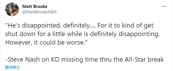 纳什表示:杜兰特非常失望,绝对的,他对暂时不能复出感到很失望,然而有时候事情总是会变得很糟。杜兰特的第二次核磁共振成像结果显得更清晰,我们需要对此更加谨慎。