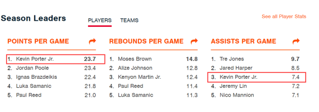 这位20岁的左手将已经打了10场G联赛的比赛,场均23.7分7.4助攻5.3篮板,表现很全面,场均得分排名G联赛第一,场均助攻位居G联赛第三。不少美媒把他成为休城的下一个哈登,他当然没有哈登级别的实力,但他的打法和哈登很相似,而且很有潜力。波特本人也曾表示,自己的偶像就是哈登,在一些领域曾模仿哈登的打法。