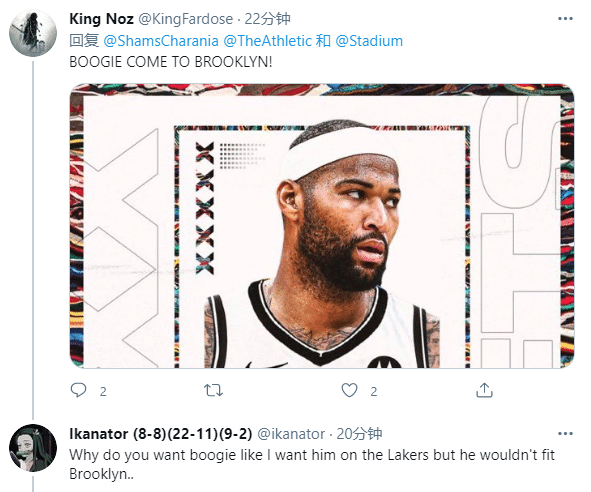 在名记动态评论区,篮网球迷第一时间晒出考辛斯身穿篮网球衣的P照,并且写道:表妹正在去布鲁克林;然后湖人球迷回应:我想要考辛斯加盟湖人,他不适合篮网;篮网和湖人球迷争起来了,究竟考辛斯会去哪儿?目前仅有雄鹿和快船因硬工资帽的原因没有资格签他。