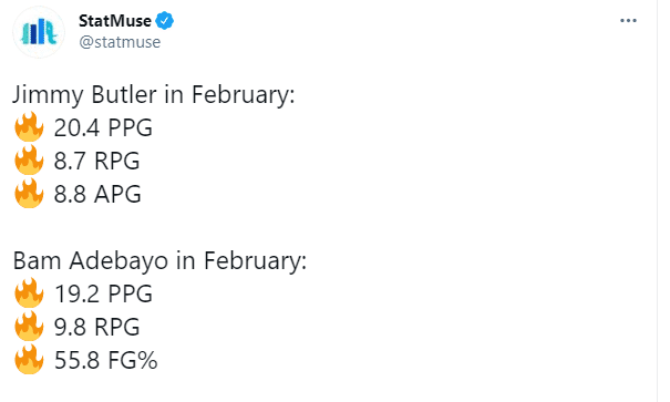 上赛季打入总决赛的热火状态逐渐回暖,在今天对阵猛龙的比赛中,球队以116比108获胜取得四连胜!过去11场比赛,迈阿密赢了其中的8场。进入二月以来,巴特勒场均可以送出20.4分8.7板8.8助攻的全面数据,阿德巴约场均19.2分9.8板命中率55.8%!两人的出色表现是热火战绩飙升的主要原因。
