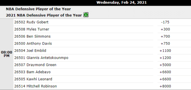 爵士球星戈贝尔是最佳防守球员赔率的领跑者。他当选最佳防守球员的赔率是-175,排名第二的特纳是+300,西蒙斯+700和浓眉+750分列第三和第四位。浓眉因伤要缺席较长时间,能对戈贝尔构成威胁的主要是特纳和西蒙斯。
