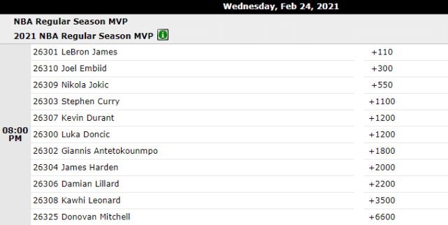 湖人球星詹姆斯是常规赛MVP奖项赔率的领跑者,他当选常规赛MVP的赔率是+110,恩比德是+300,约基奇是+550,他们三人依然是这一奖项的最有力竞争者。詹姆斯的优势不算很大。