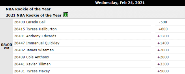 黄蜂的探花秀拉梅洛-波尔,是年度最佳新秀赔率的领跑者。他当选年度最佳新秀的赔率是-500,而排名第二的国王新秀哈利伯顿是+600。哈利伯顿是很出色的新秀,但波尔打上首发后数据全面上扬,哈利伯顿恐怕很难战胜他,再加上国王的战绩不如黄蜂,二者之间的差距很大了。不少美媒认为,波尔已经提前锁定最佳新秀的奖项。