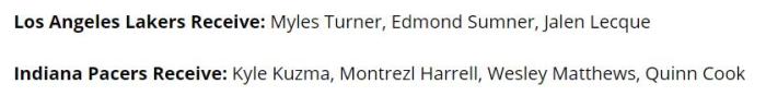 于是美国知名体育媒体《nbaanalysis》专栏记者Greg Patuto撰文分析,建议湖人打包送出库兹马、哈雷尔、马修斯和库克,以此从步行者换来特纳、萨姆纳和贾伦-莱克。