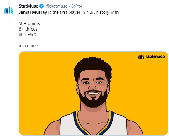 穆雷职业生涯已经三次单场50+成掘金队史第一人,单场50分创赛季新高和生涯新高。