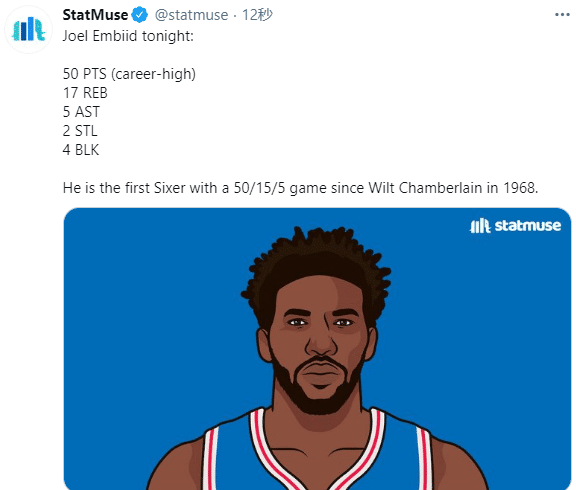恩比德疯狂一战创纪录,单场轰下50+15+5比肩名宿张伯伦,成为队史近53年第一人;NBA联盟1985年有数据统计以来历史第一人,单场50分是恩比德生涯新高;球迷常说大帝出征寸草不生,如今大帝打出疯狂一战,关键中投终结比赛,当时恩比德站在球场上高居双臂庆祝。