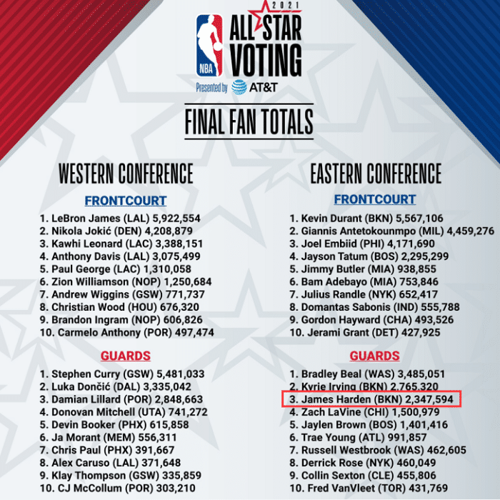 JRS直播网2月19日讯全明星球员们的总票数也已经公布了,这其中哈登有些尴尬,他不仅无缘西部首发,而且在总票数上仅仅位居第13名,这位上个赛季NBA得分王去到东部之后没有了首发位置,他的票数是2347549票。